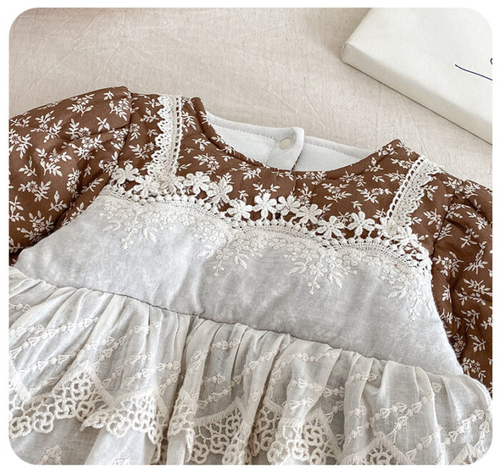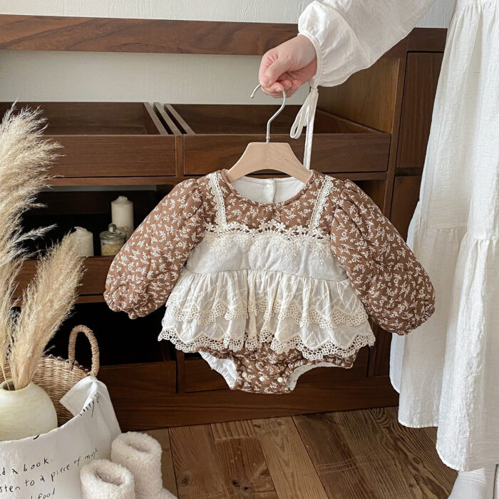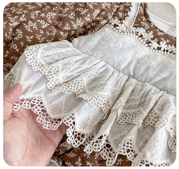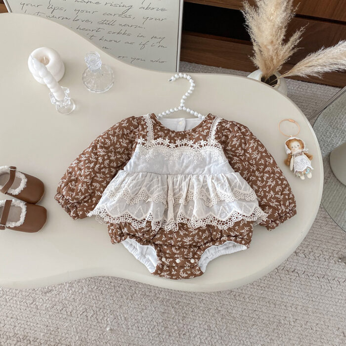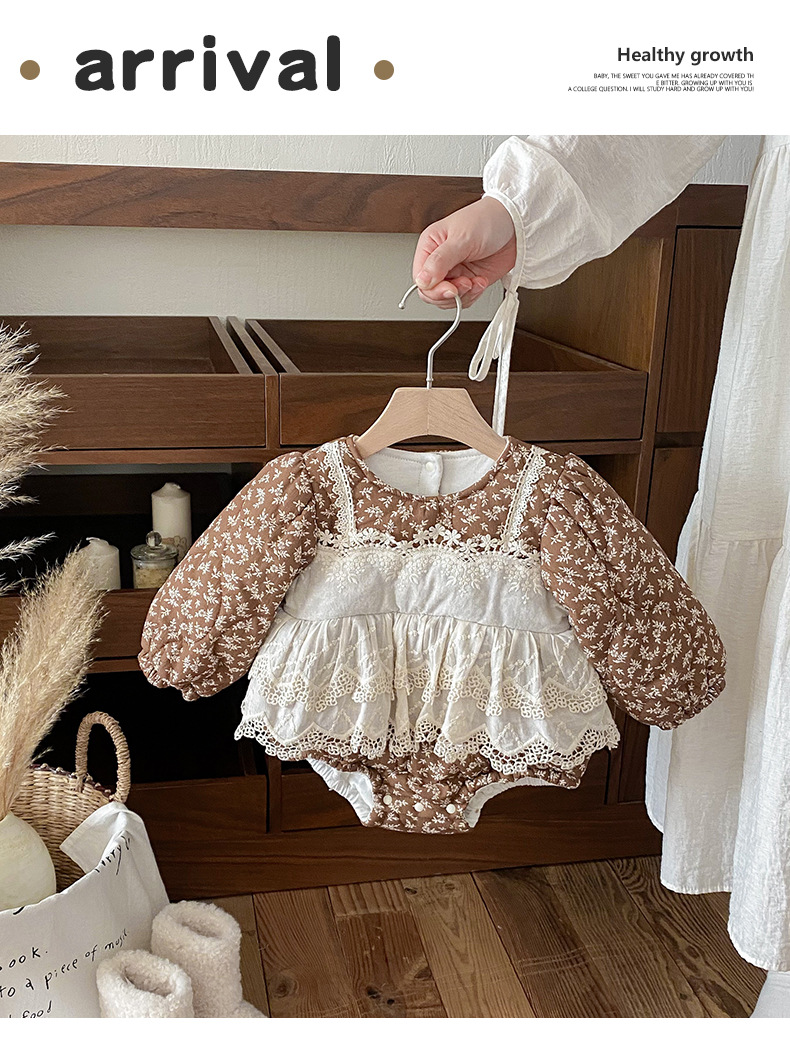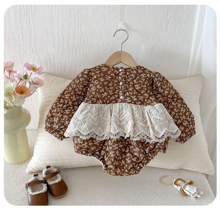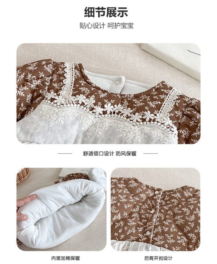 韓版冬季66~90cm – 碎花加絨絎縫蕾絲假兩件包屁衣