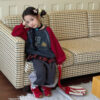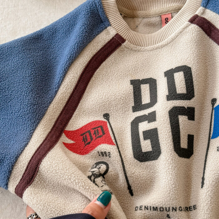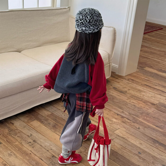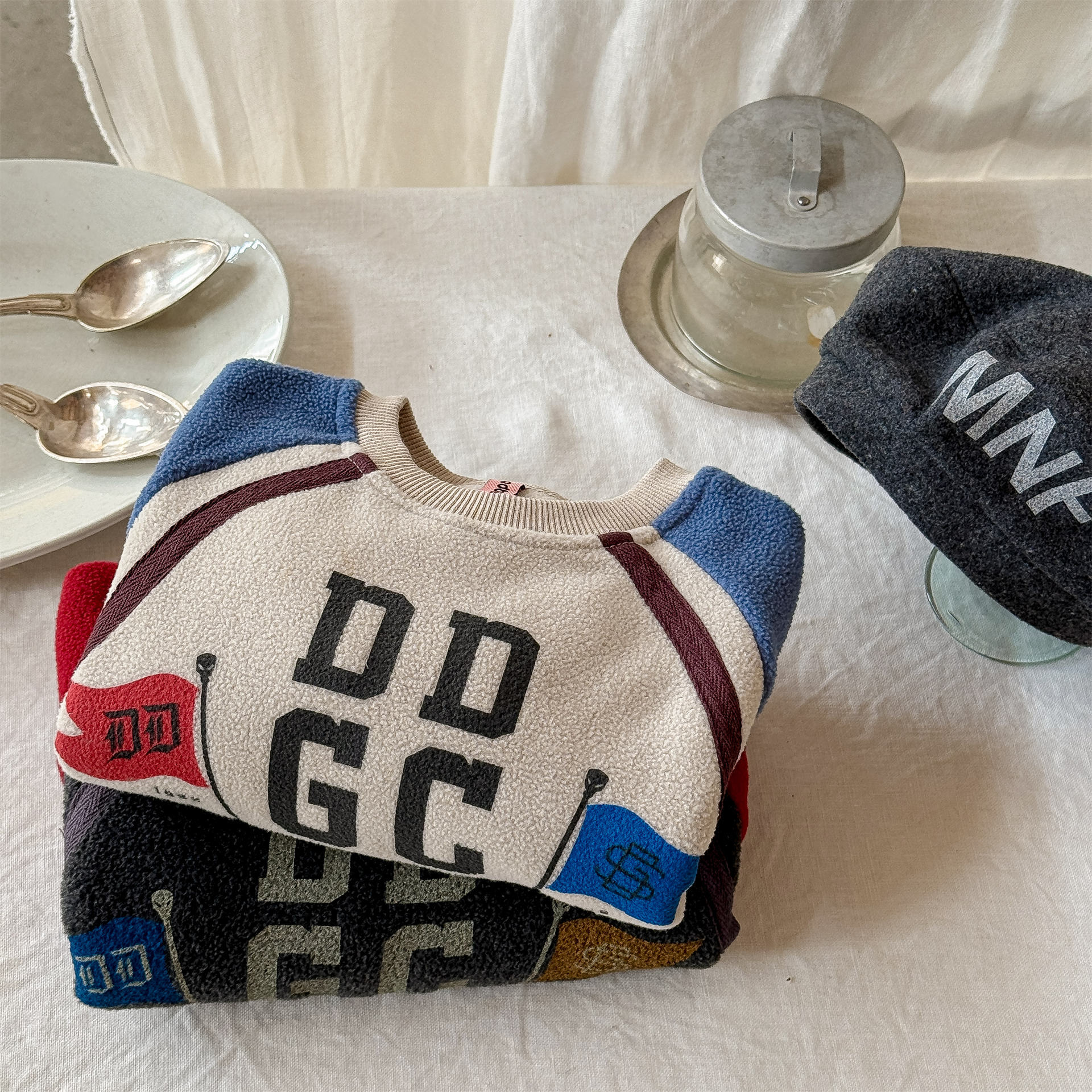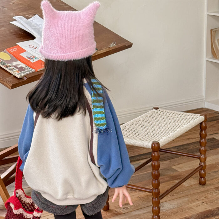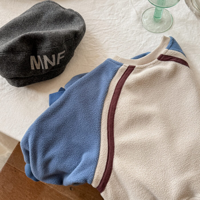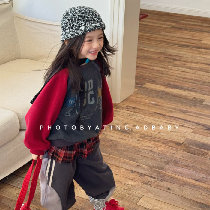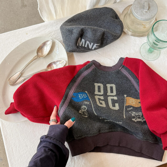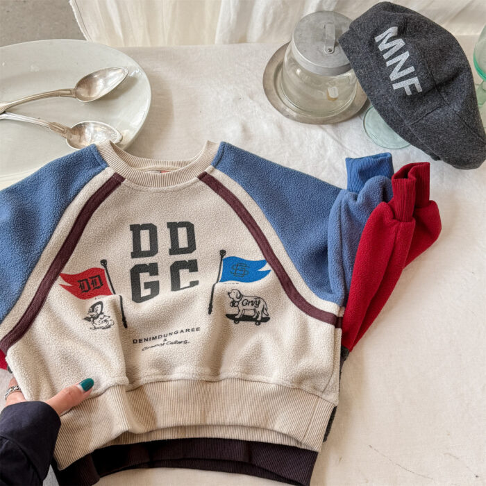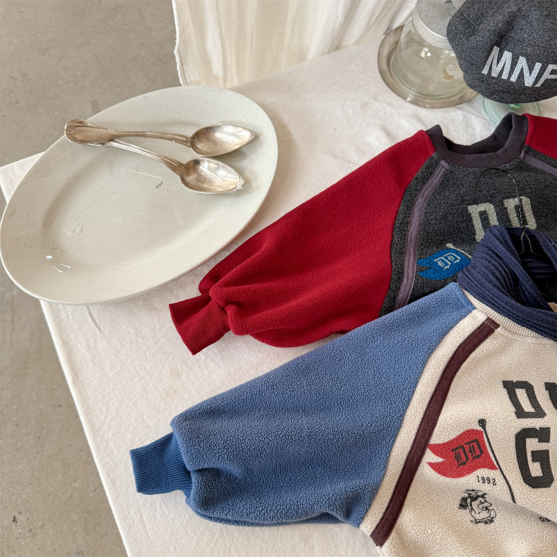 韓版冬季80~130cm – 拚色抓絨印花上衣 / 二色