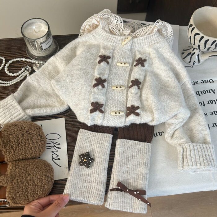 韓版秋冬80~150cm – 蕾絲連帽毛衣外套 / 打底褲