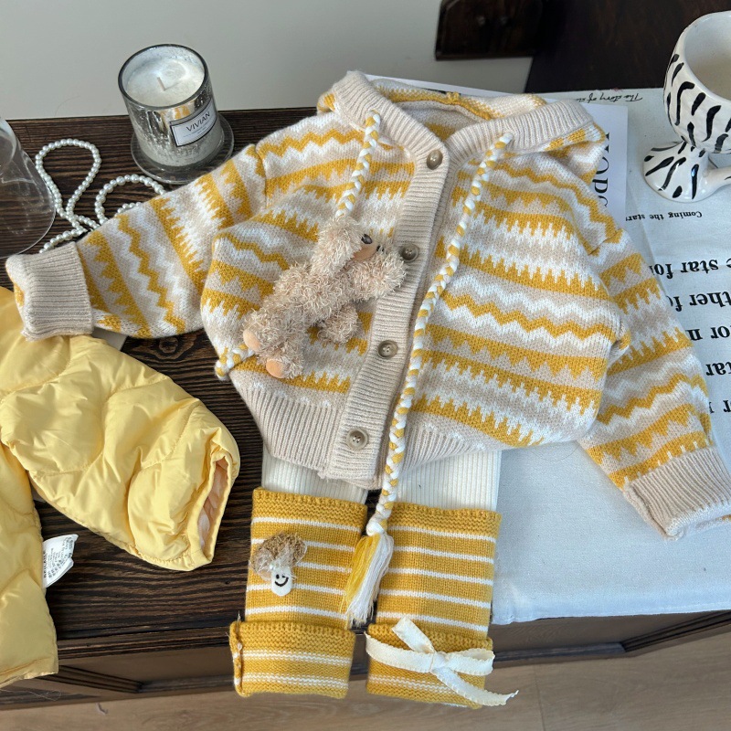 韓版秋冬80~150cm – 黃色針織條紋連帽外套 / 打底褲