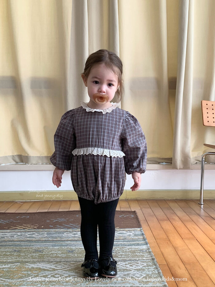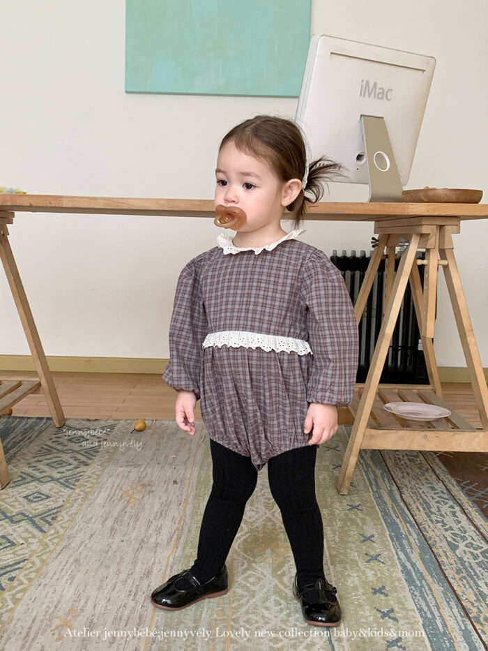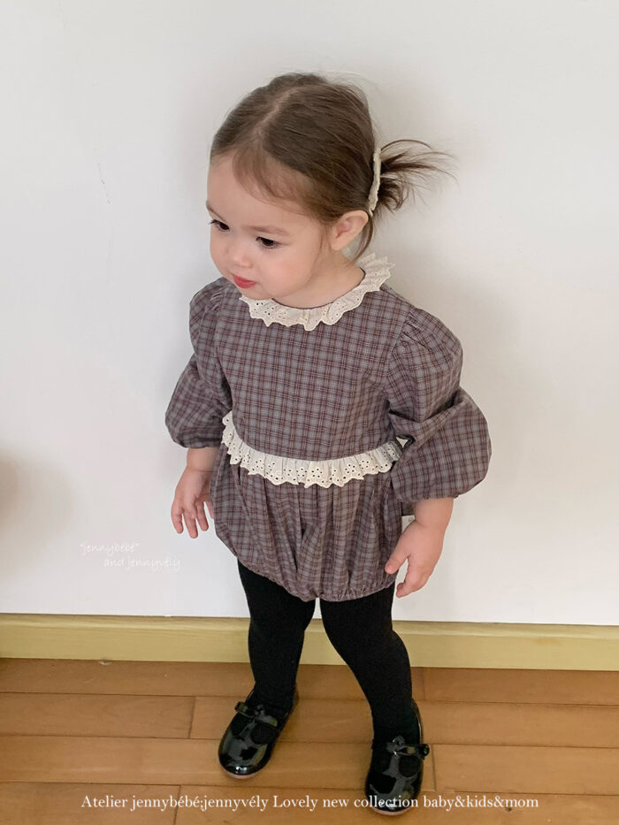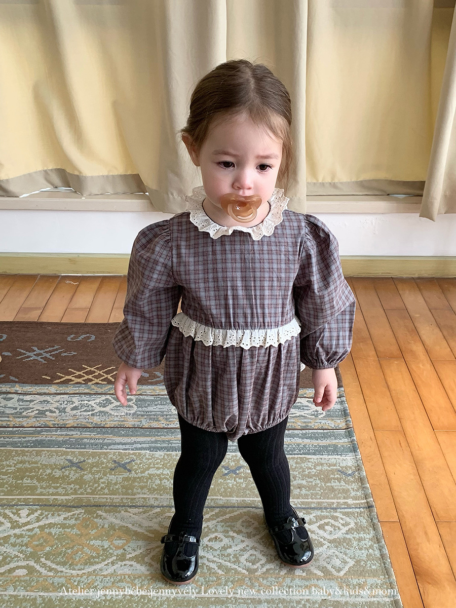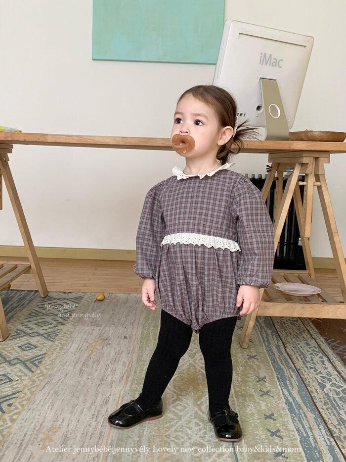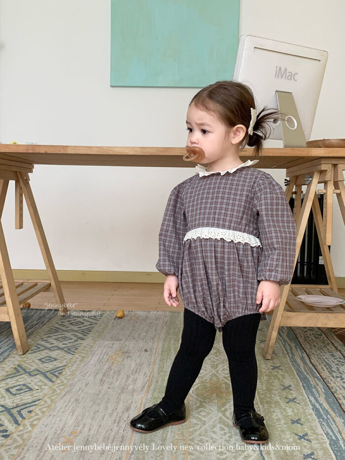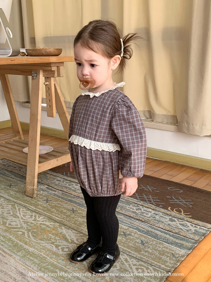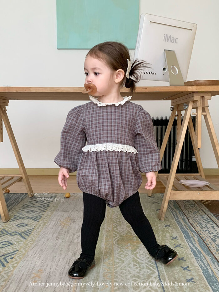 韓版秋季 66~90cm – 格紋蕾絲包屁衣