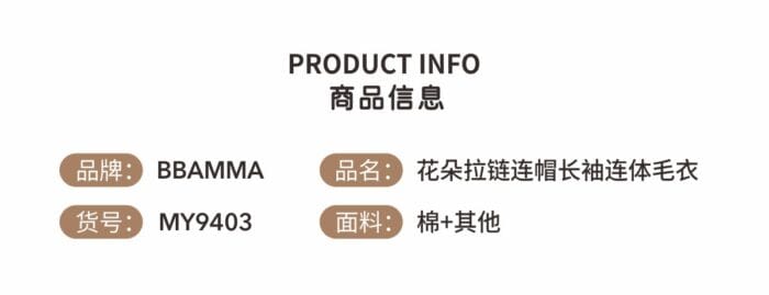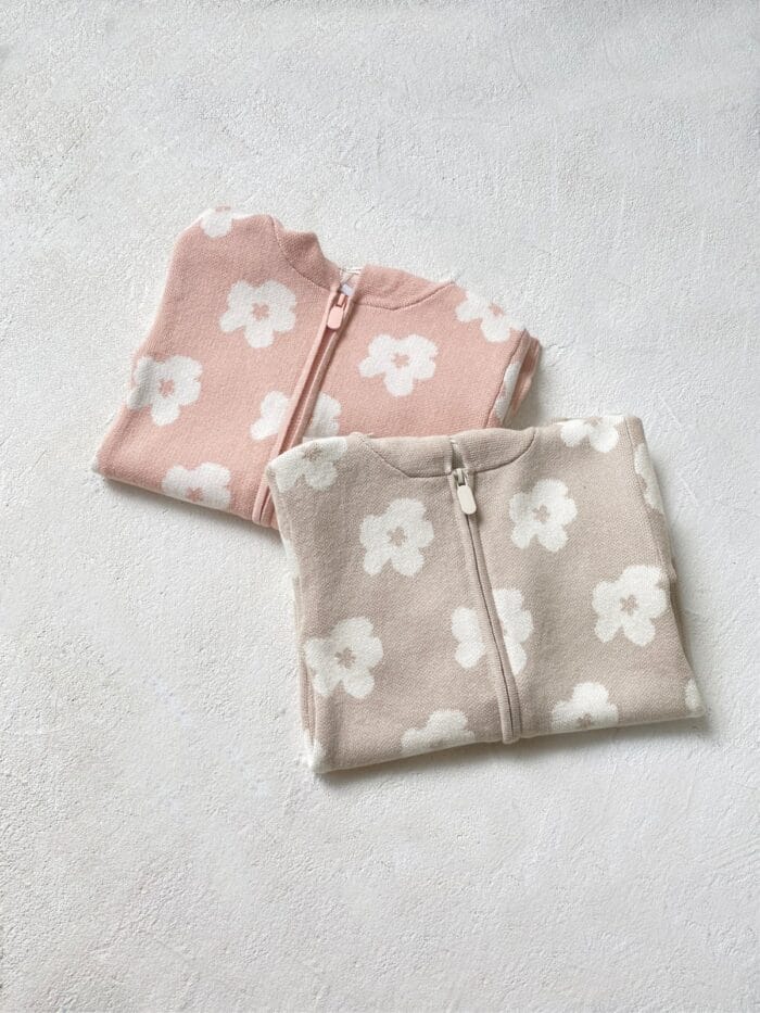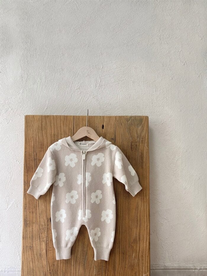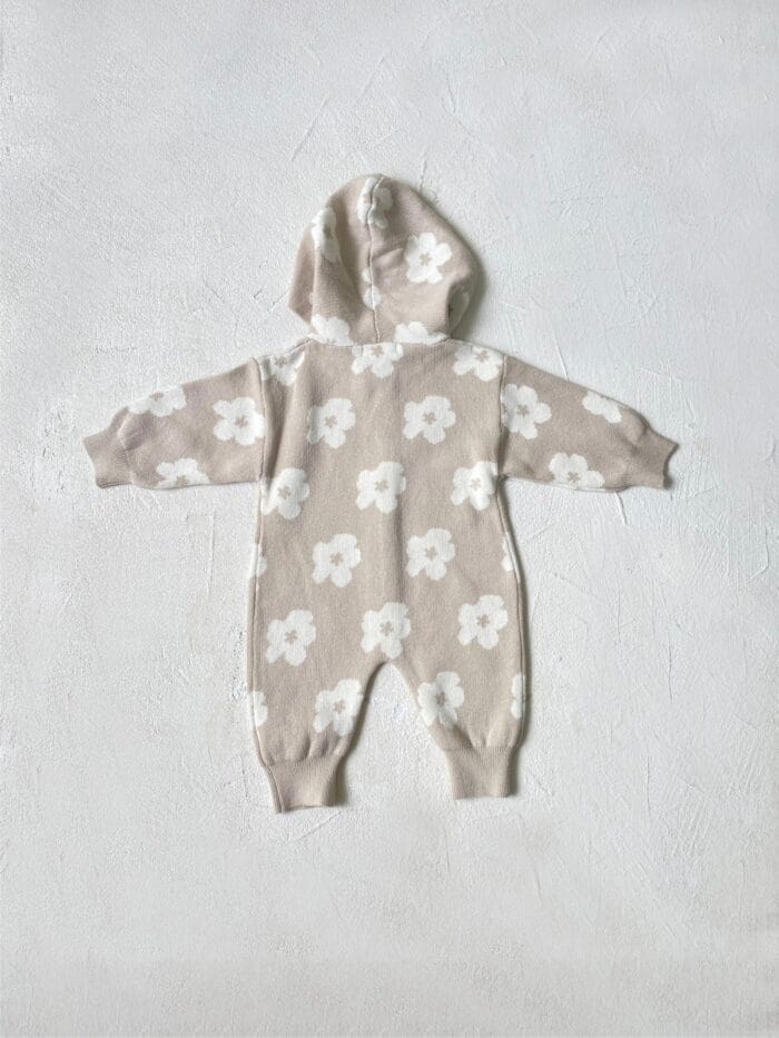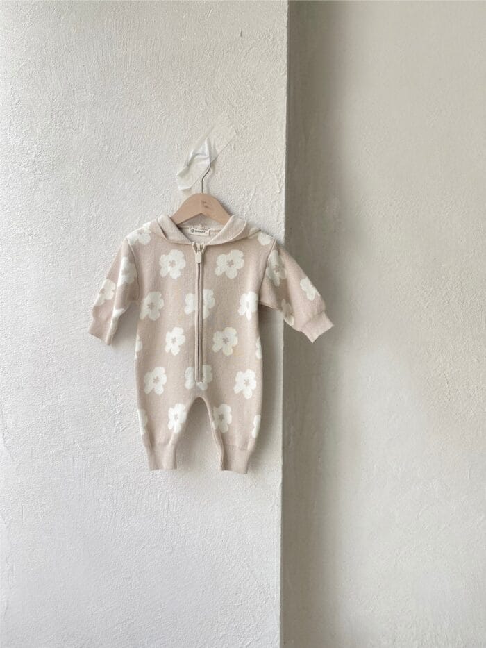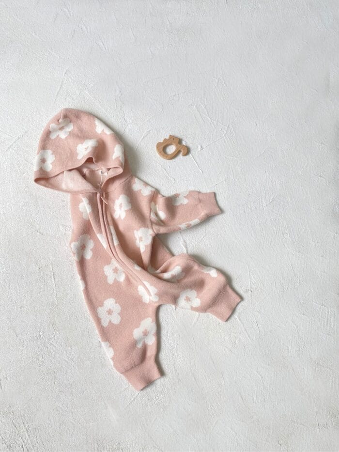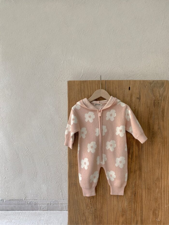 韓版66~90cm – 花朵連帽拉鍊連身衣 / 二色