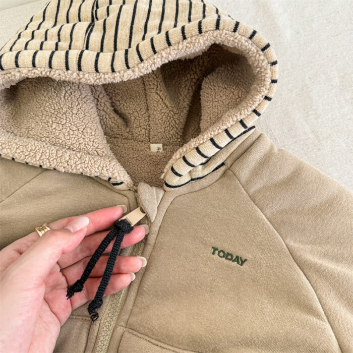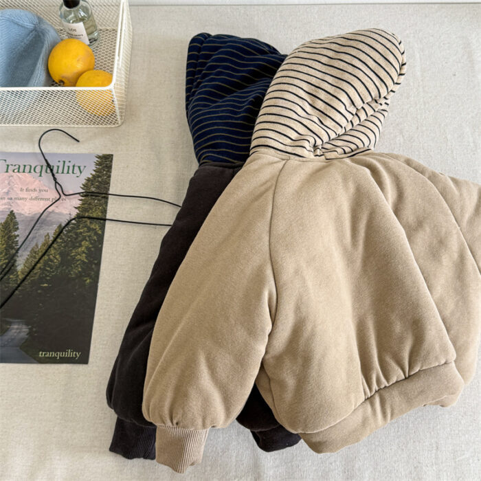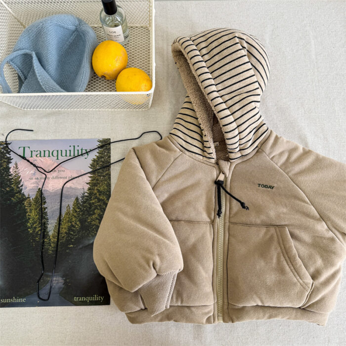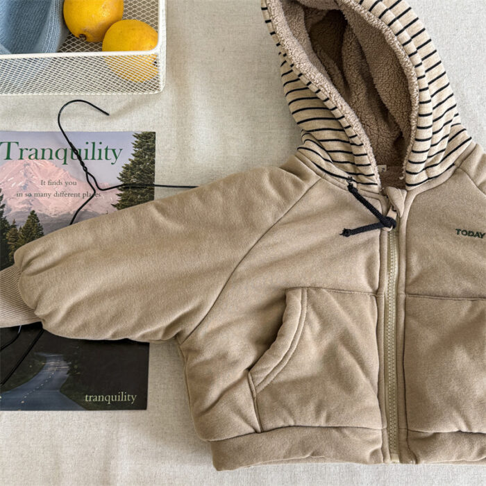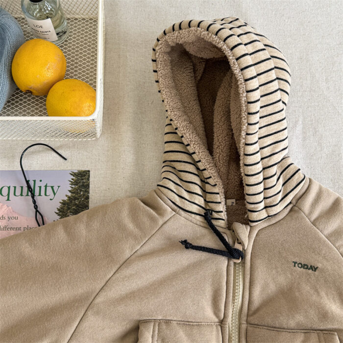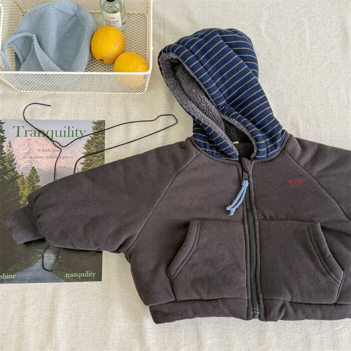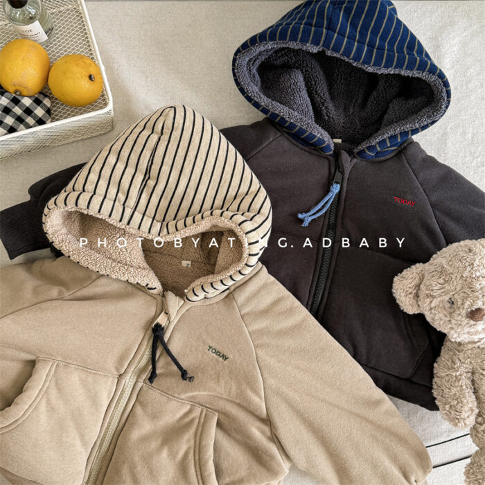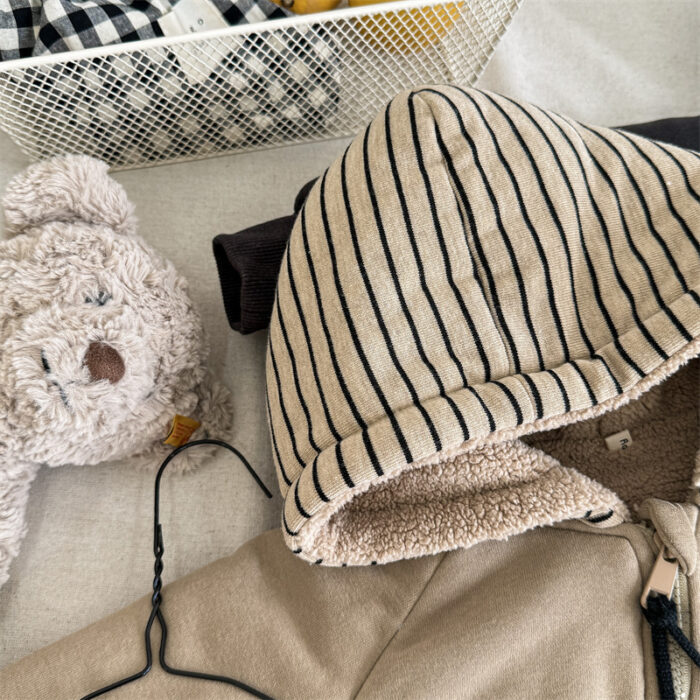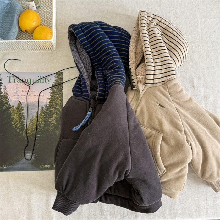 韓版80~130cm – 加絨橫條連帽外套 / 二色